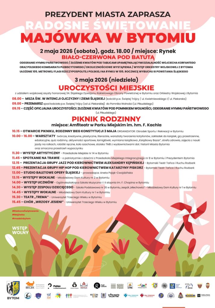 Serdecznie zapraszamy mieszkańców do udziału w rekreacyjnym Rodzinnym Biegu Konstytucji 3 Maja, który odbędzie się 3 maja 2026 roku w Parku Miejskim im. hm. F. Kachla.